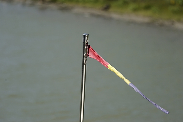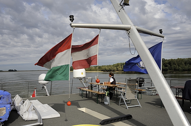 Die rumänische Schiffsfahne am Fahnenmast des Bootes |