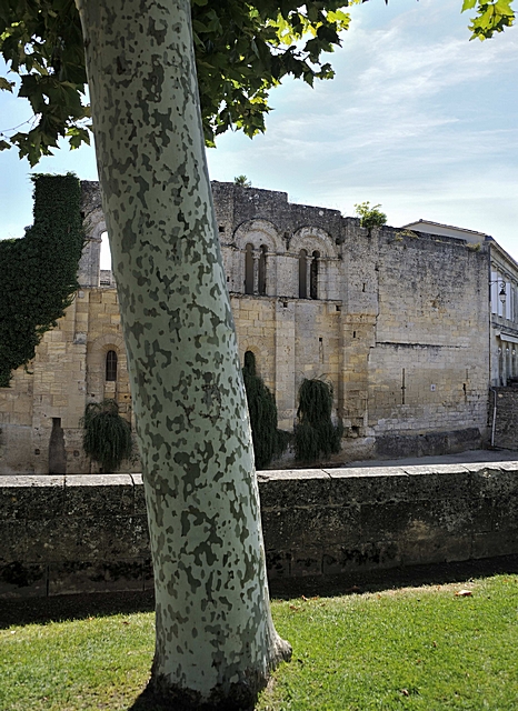 Der Stamm einer Platane vor der Stadtmauer von Saint-Émilion.
