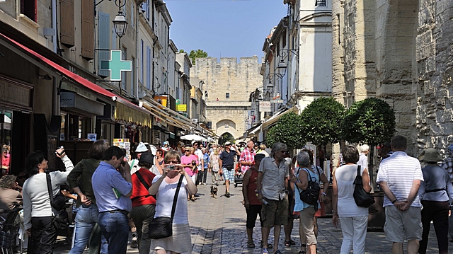 Touristen in einer engen Straße vom Aigues-Mortes.