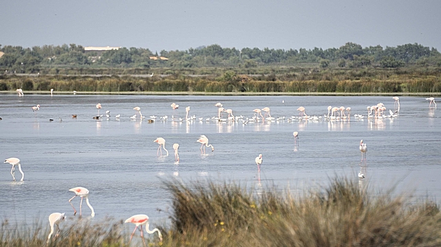 Camargue, Heimat der weißen Wildpferde, rosa Flamingos
