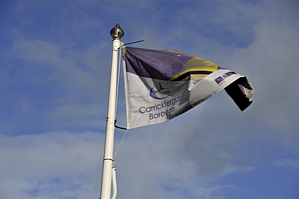 Die Fahne des Verwaltungsbezirks Carrickfergus. |