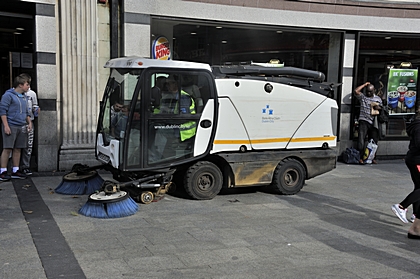 Ein Putzfahrzeug reinigt die Gehsteige. |