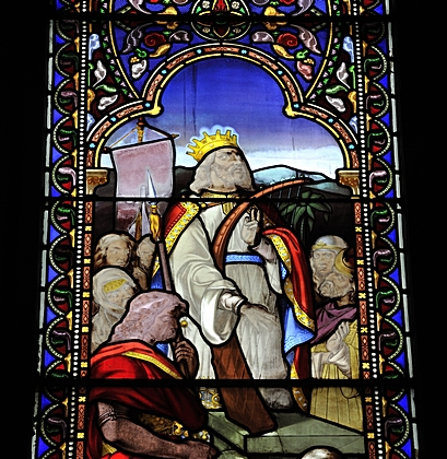 Links König Saul mit Schwert und Rundschild, in der Mitte David mit Stab und
