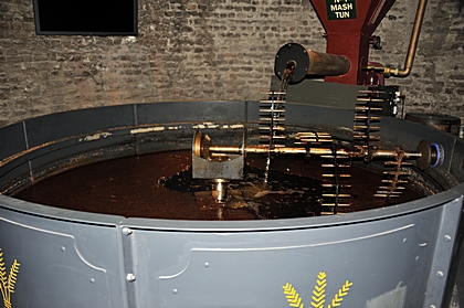 Schrot wird in einem Maischebottich mit heißem Wasser vermischt. |