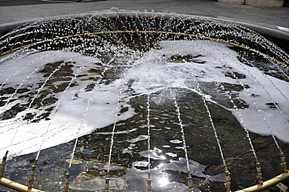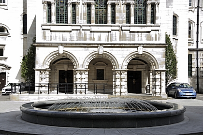 Das Spiel des Wassers am Brunnen im Innenhof des Rathauses von Belfast. |