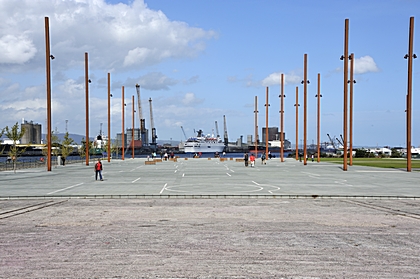Blick über die dargestellte Fläche der Titanic zum Hafen von Belfast. |