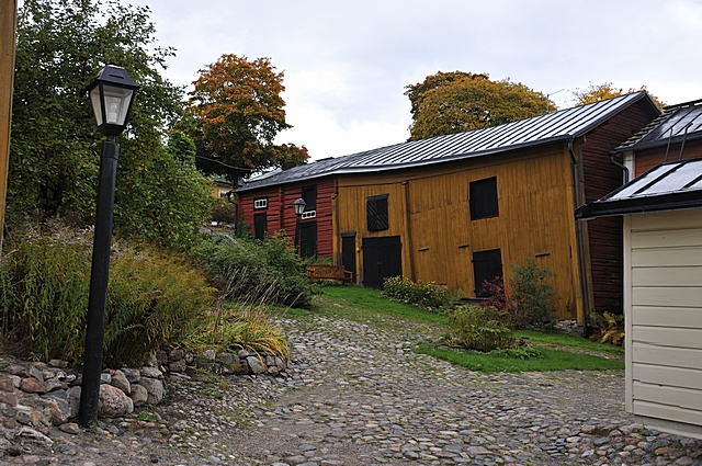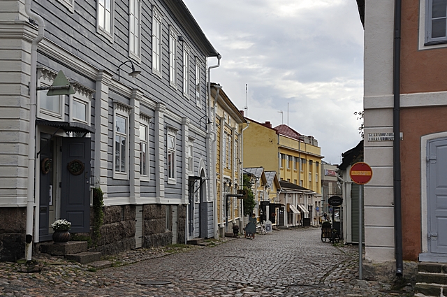 Eine Gasse und Holzhäuser in Porvoo. |