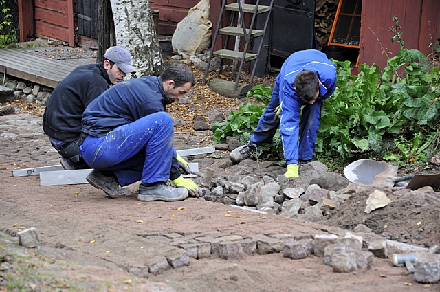 Steinarbeiter setzen Pflastersteine auf einer Gasse. |