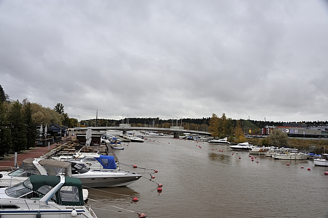 Motorboote liegen entlang des Flusses Porvoonjoki. |