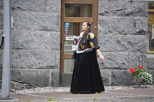 Eine Frau präsentiert ihre großartige finnische Tracht. |