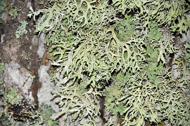 Pflaumenflechte, Evernia prunastri am Stamm einer Eiche. |